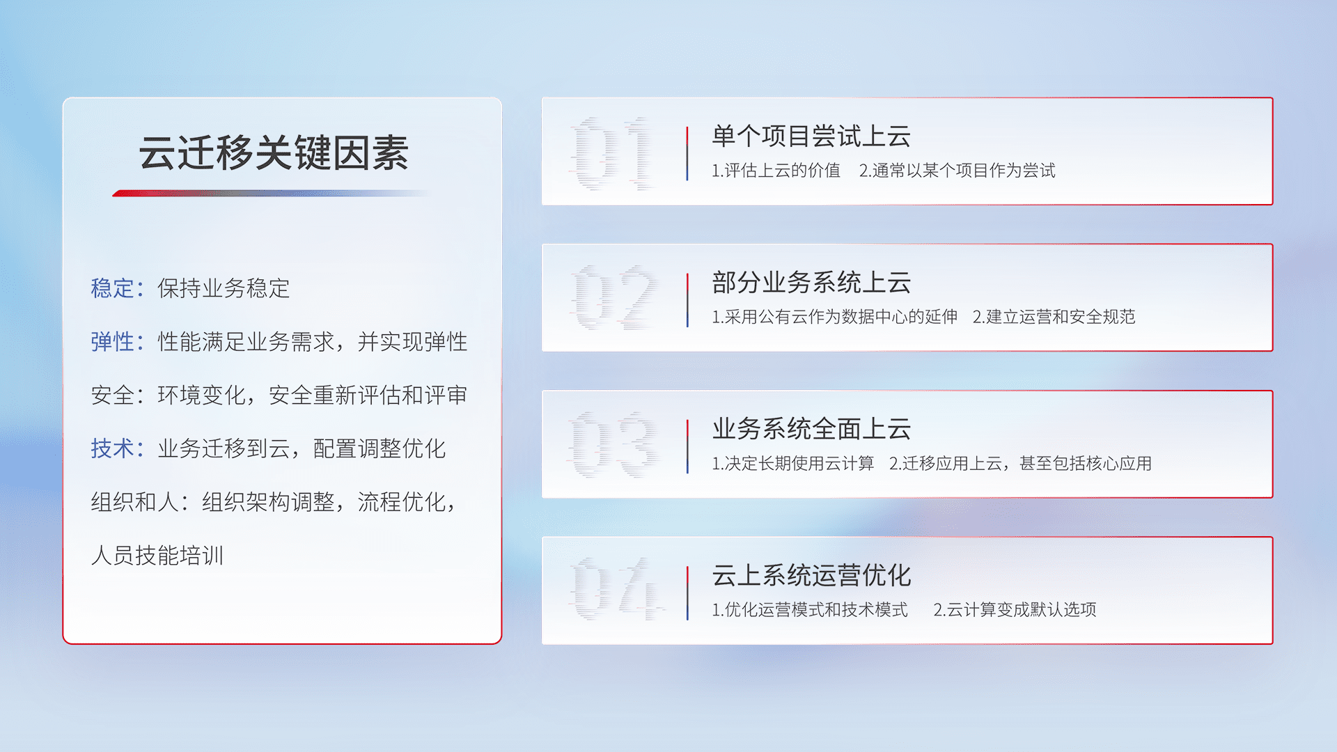结合实际业务,,,,从规划设计、、、、云平台选型、、、云原生改造、、、、数据迁移、、集成交付,,迁移全过程为客户识别最佳上云路径,,,做好风险识别管理,,,,设计网络架构、、身份权限、、安全审计合规、、操作审计、、日志审计、、监控告警策略、、、、多站点容灾设计等,,,,对云上基础设施进行整体规划,,,提升IT治理水平,,,,以满足弹性、、、高可用、、、高性能的需求。。。。